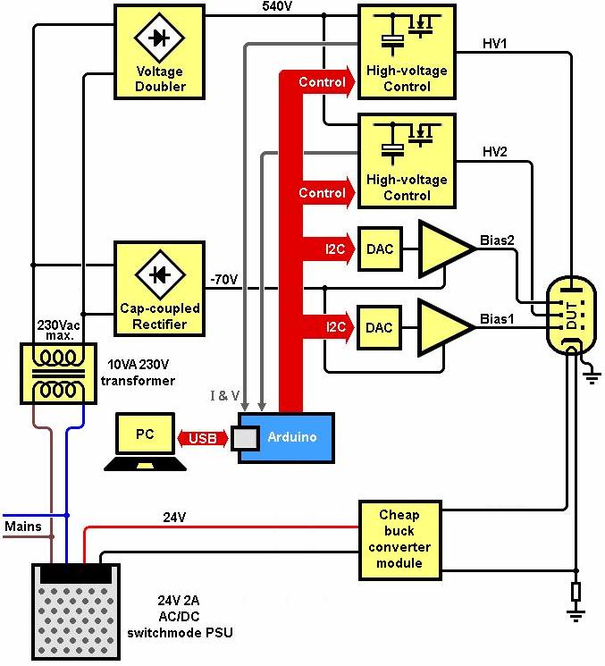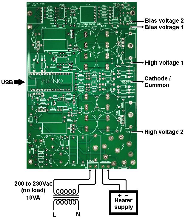The only external parts needed are a small 200-230V transformer, and a suitable source of heater power (and extra valve sockets for testing other valve types, if you want that capability).