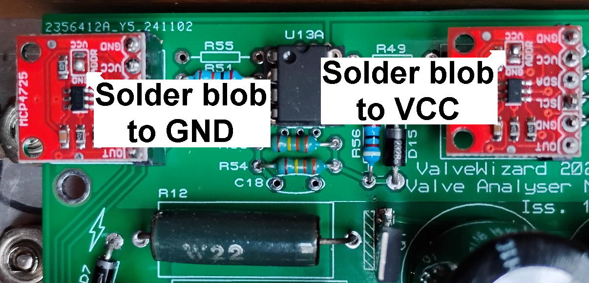 You need to mod them so the Arduino can address each DAC individually; this is done by adding a solder blob from the ADDR pad to the VCC or GND pad on the little PCB, as shown in the photo.