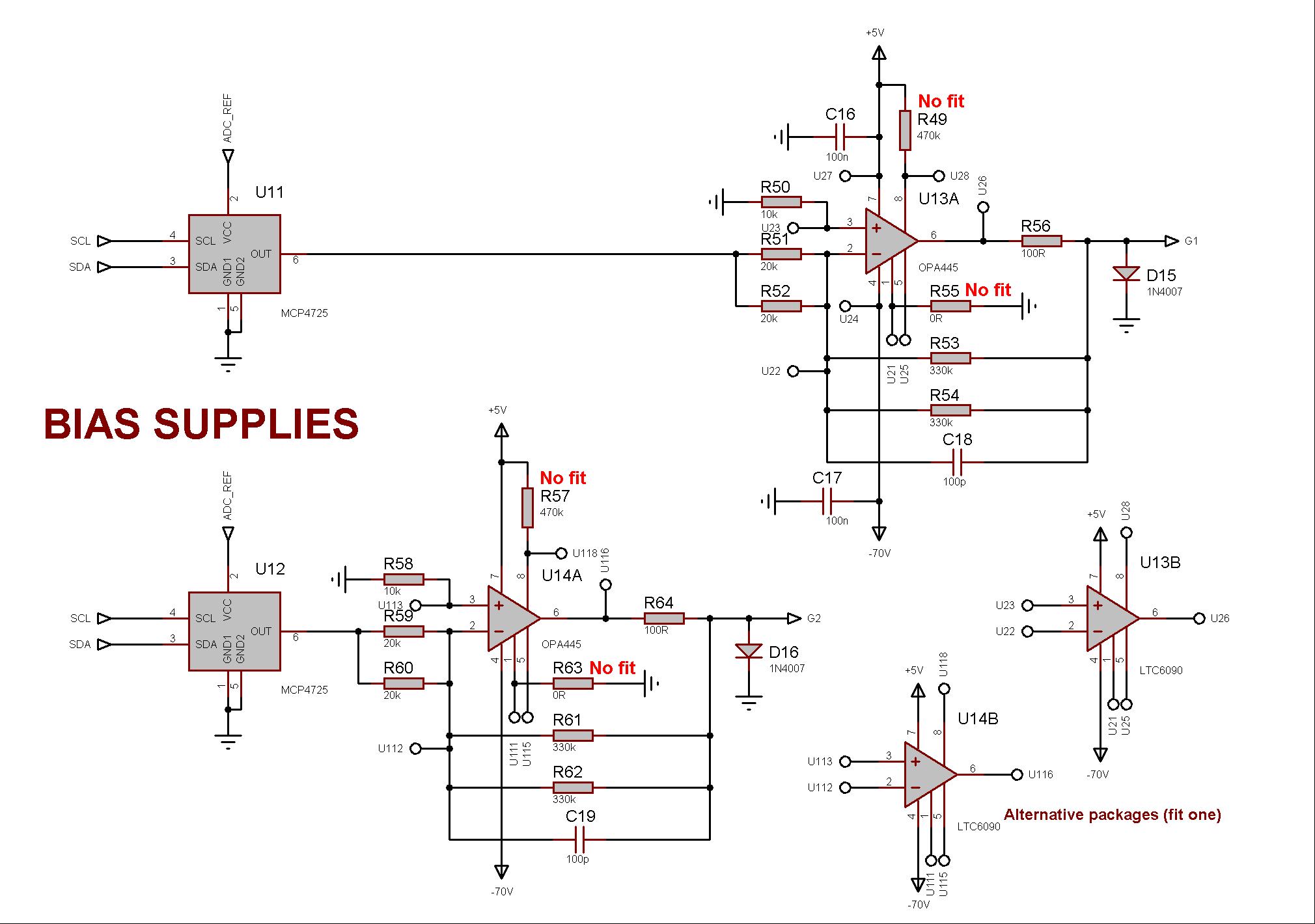 The positive voltage produced by each DAC is therefore inverted and amplified by a factor of -16.5 by a OPA445 high-voltage opamp, making a little over -60V available in fine 16.5mV increments.