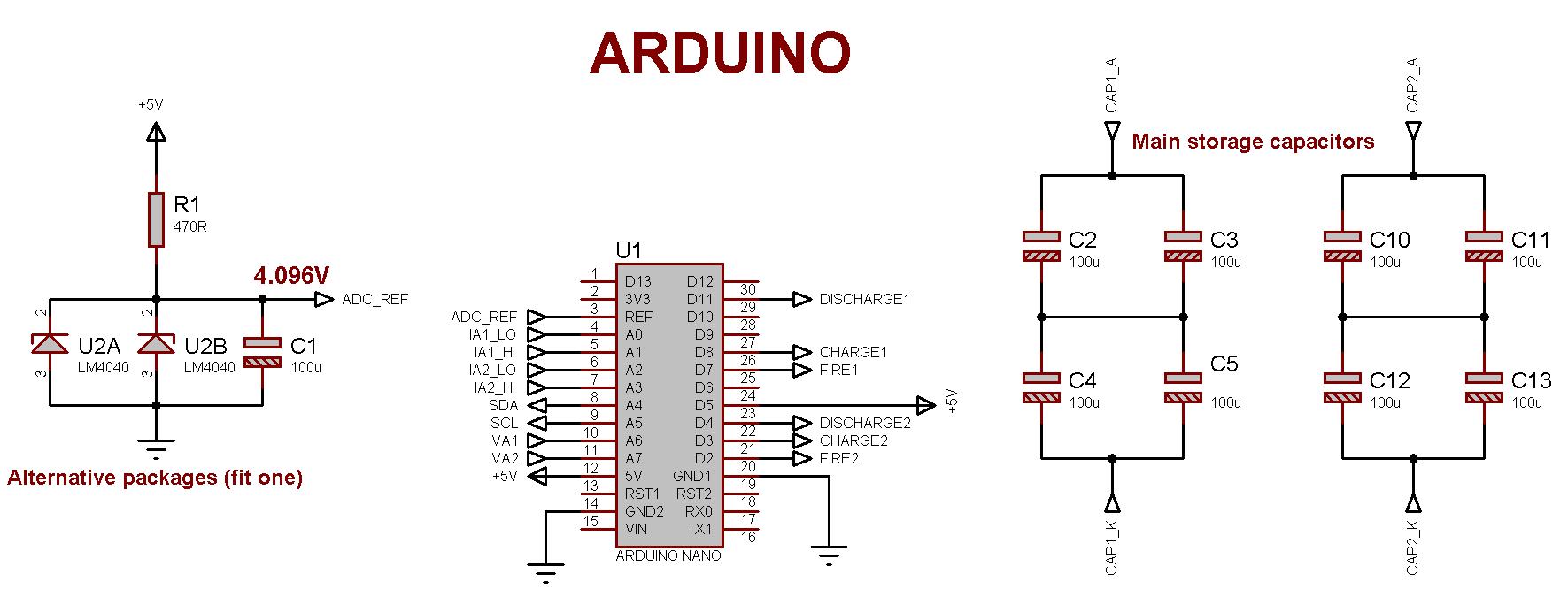 This schematic shows the Arduino and HT storage capacitors C2-5 and C10-13.