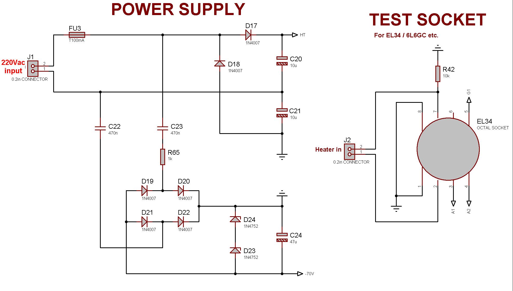 I have put the whole thing on a single PCB (file at the bottom of this page) complete with a pre-wired octal socket for testing 6V6/EL34/6L6/5881/KT66 etc.